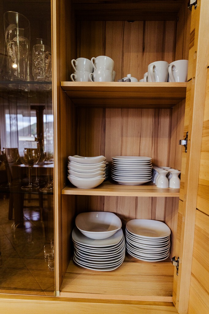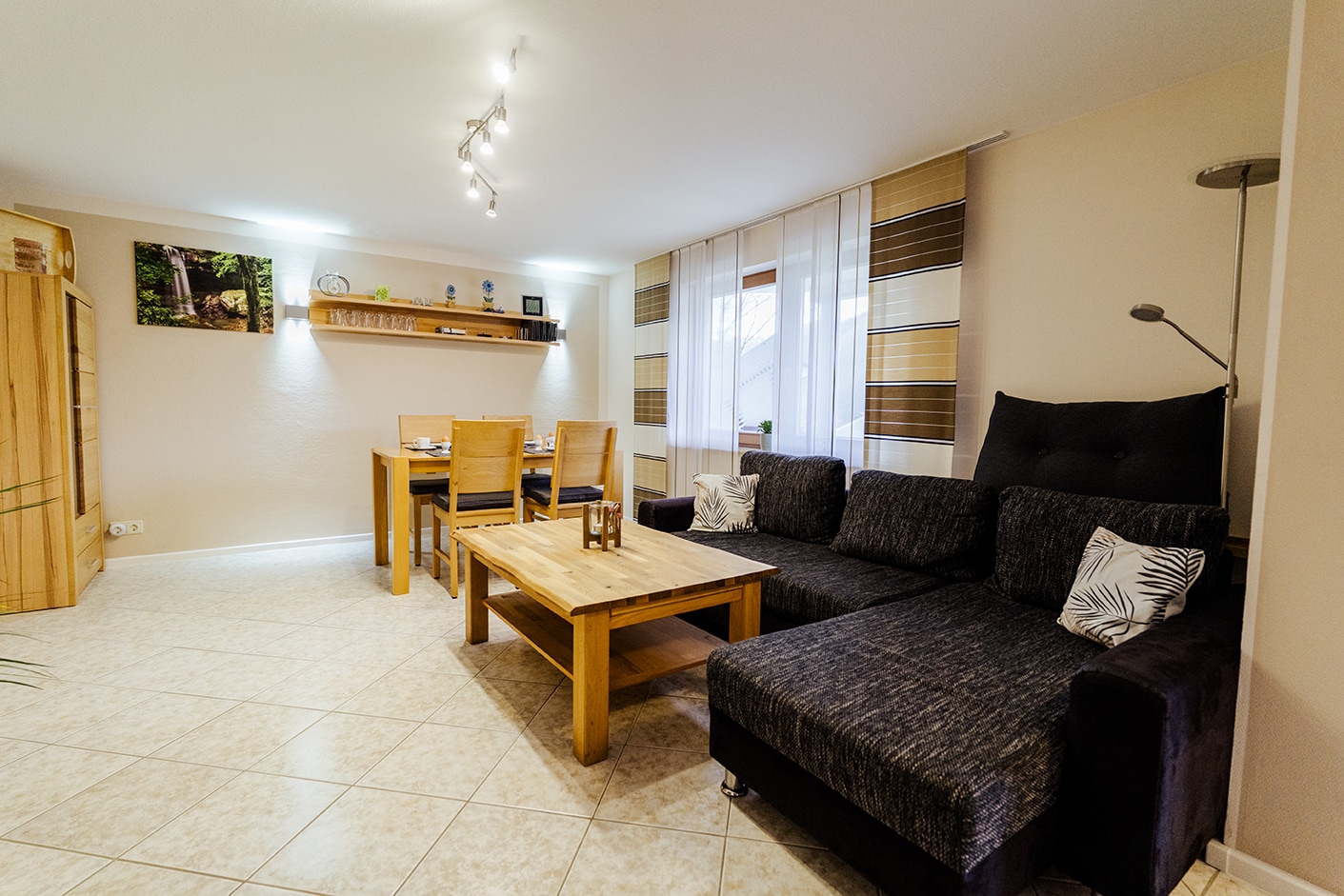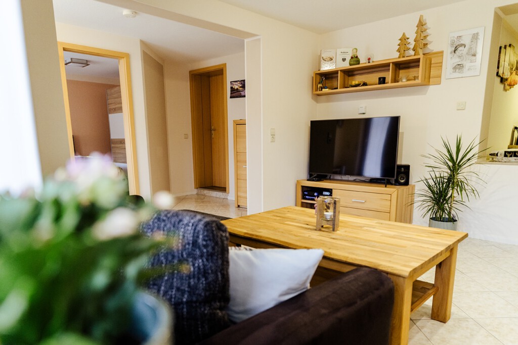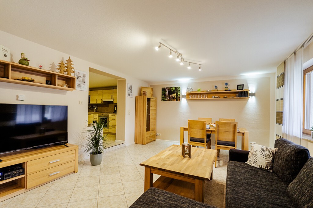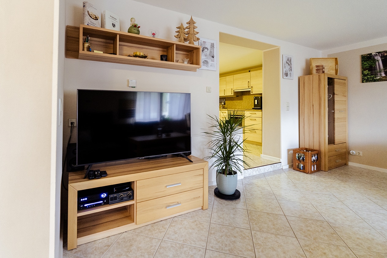 Der Wohn- und Essbereich ist mit Massivholzmöbeln aus Buche und Kernbuche eingerichtet und bietet alles für entspannte Stunden: ein großer Flachbildfernseher, eine Stereoanlage mit bequemem Sofa. Für Freizeitspaß steht ihnen ein gut gefüllter Spieleschrank im Nebenzimmer bereit. Am Tisch lässt es sich gut und gesellig mit Blick über das Tal sitzen.