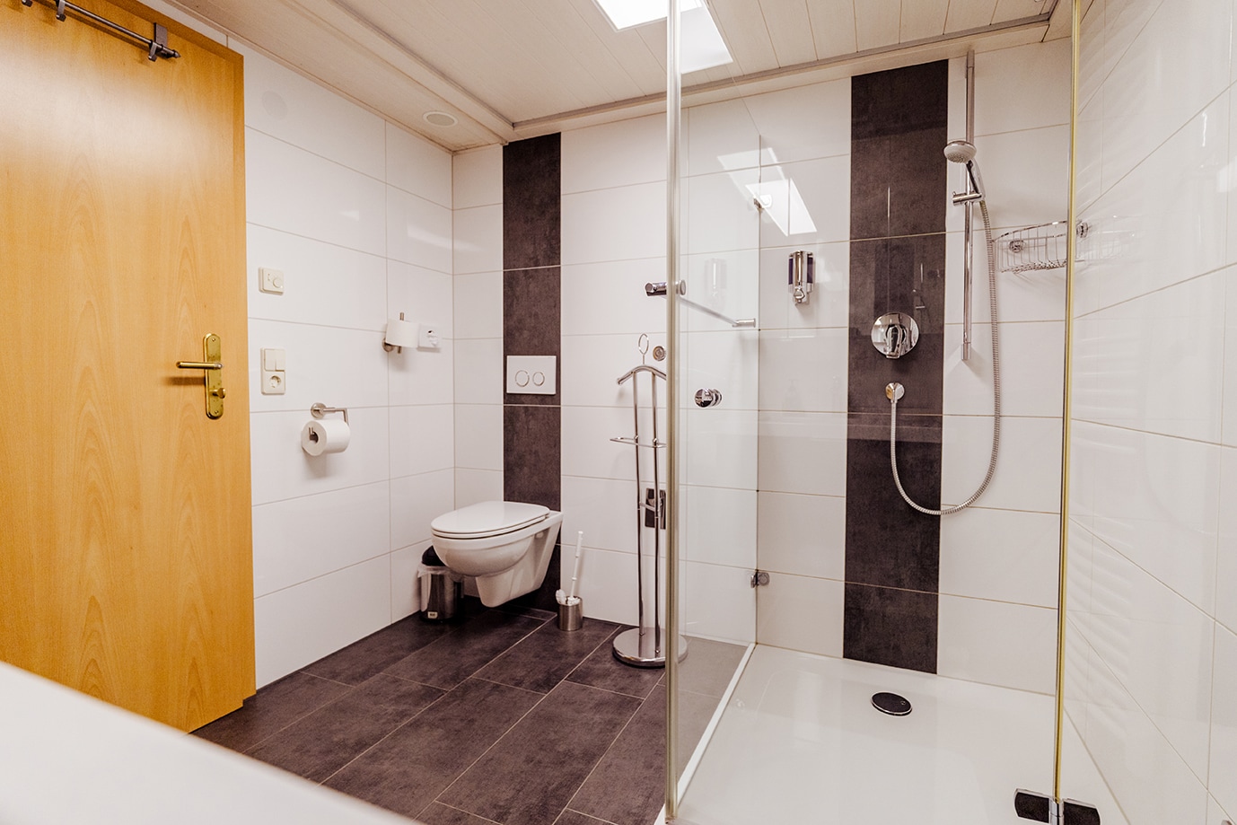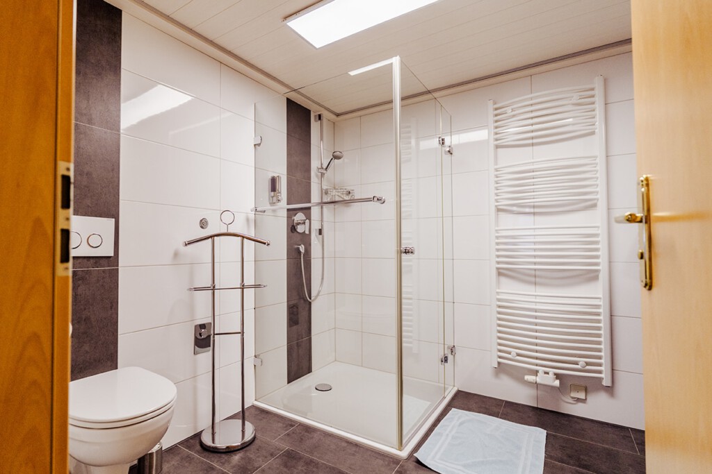 Das Bad verfügt über eine große, bodenebene Dusche, ein WC, einen großzügigen Waschtisch mit Unterschrank, Fußbodenheizung und einen Handtuchheizkörper.
