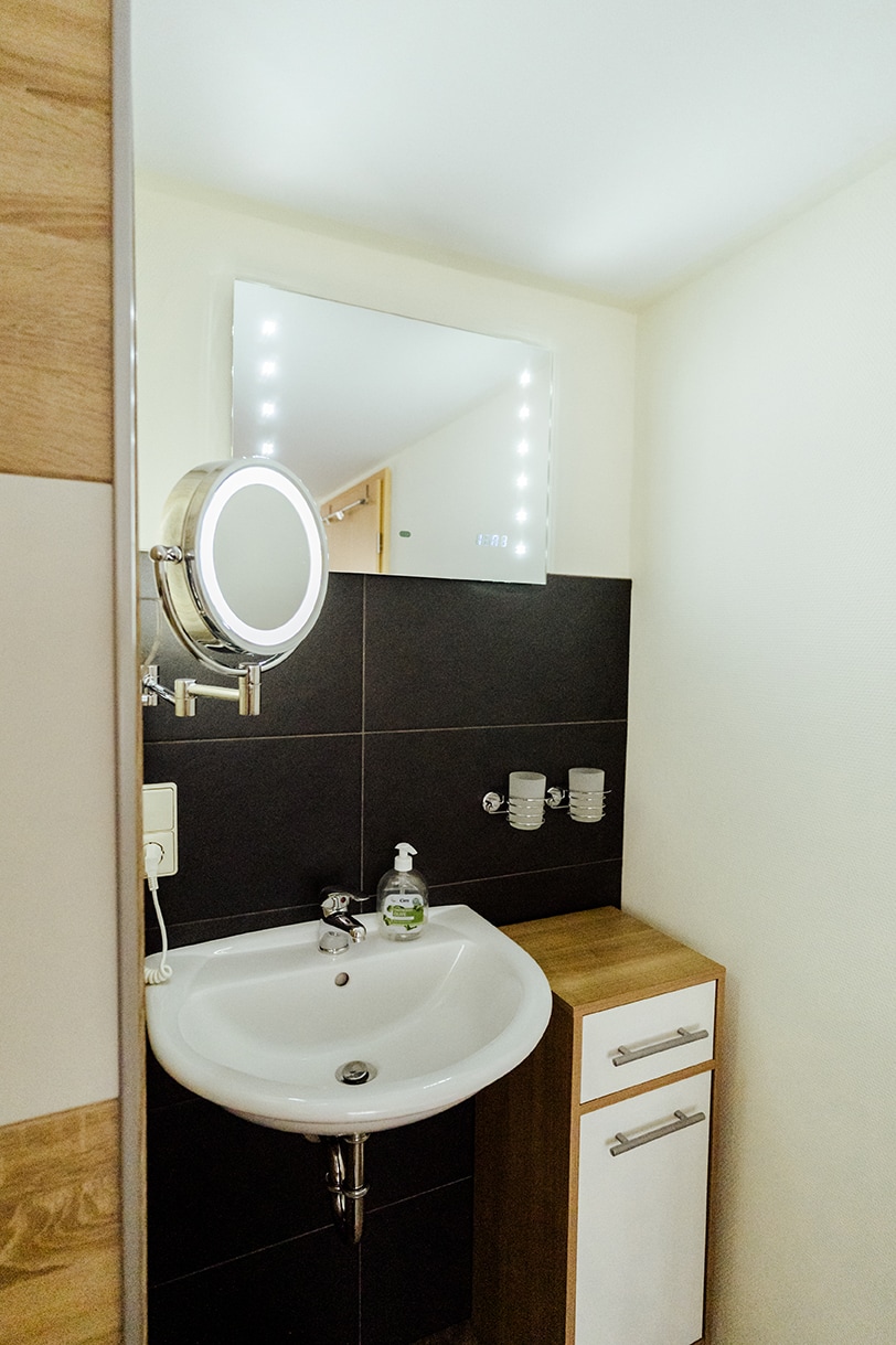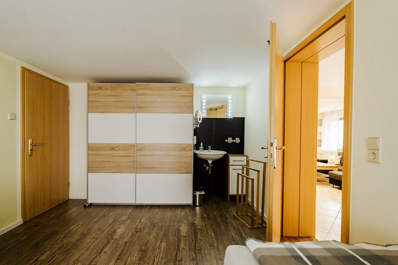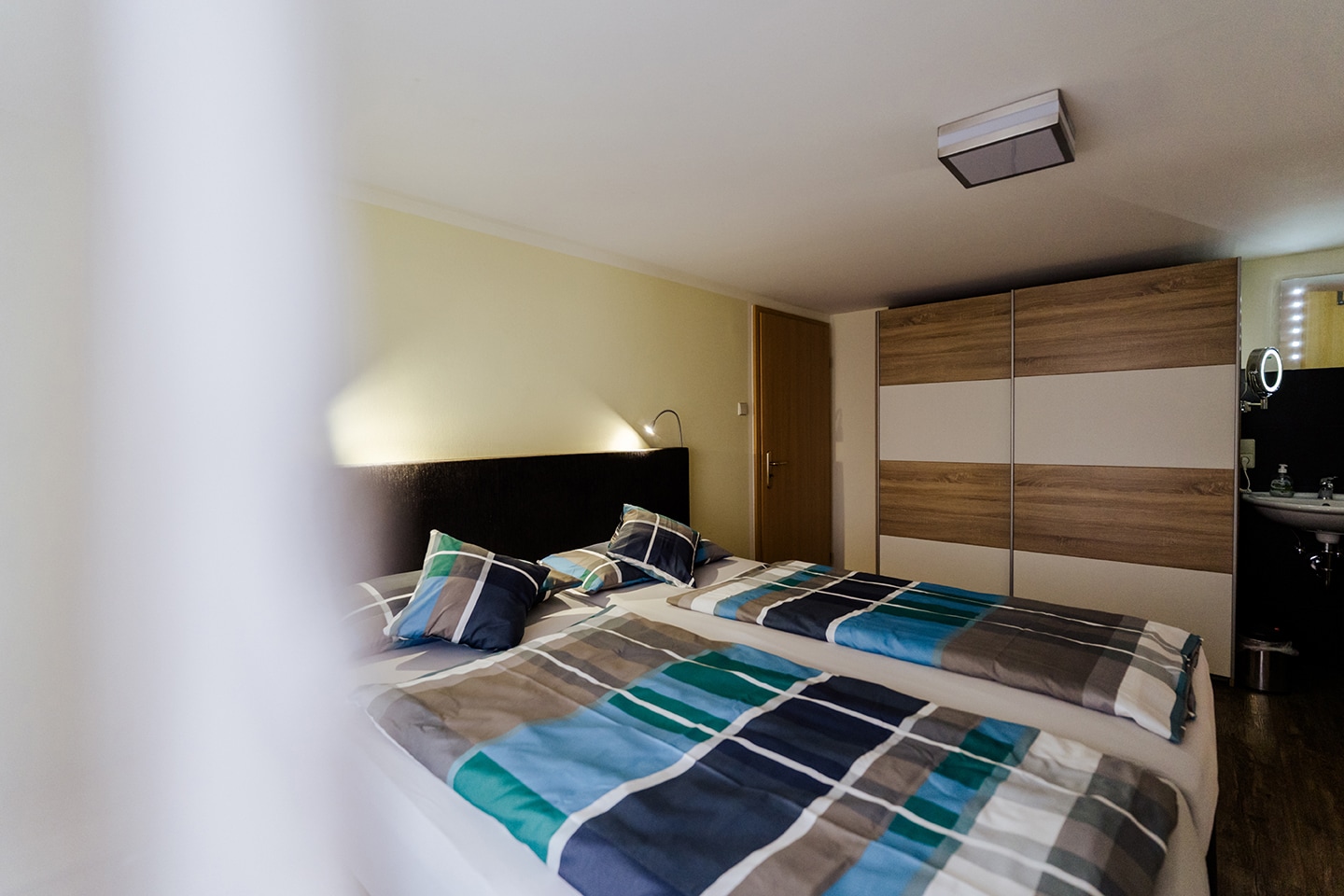 Das zweite Schlafzimmer verfügt zusätzlich über ein eigenes Waschbecken und einen Schminkspiegel – ideal für Familien oder Paare, die etwas mehr Komfort wünschen. Die Betten können bei Bedarf auch getrennt aufgestellt werden.